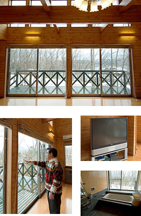 リビングの南西側に大きな窓が3つ。その先には、雑木林ごしに那須連山の美しい山並みが広がる。西側にも茶臼岳を間近に望む窓が設けられており、まさにピクチャーズ・ウインドウだ。この建物のオーナーは、昨年11月に東京から移り住んだMさん。眺望に合わせて建物を設計したのかと思いきや、その逆だという。